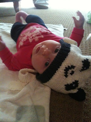 our little lady is almost double her birth weight (6lbs. 12oz.), she smiles, giggles, rolls over both ways (look out) and has a lot so fun trying to scoot around in circles when on her quilt. let's just say i better get back in shape quickly so i can chase her around the house. it's so fun to watch her develop but can she stay small for a little while? here are a couple pictures of her over the holidays...her grandma mimi got her this hat, pretty cute huh?